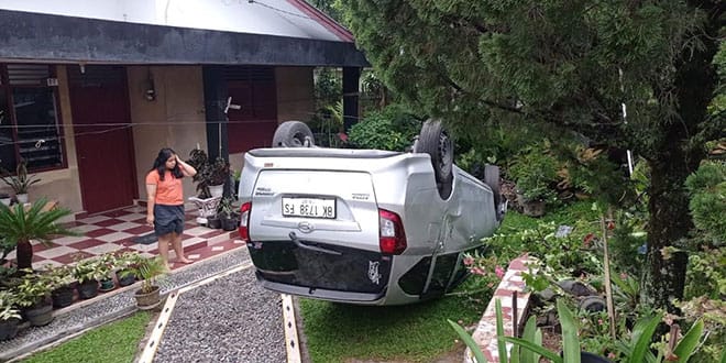 Mobil tersebut menabrak pengendara sepeda motor lalu terbalik di depan rumah salah seorang warga bernama Acen Sinaga di Jalan Enggang, Kelurahan Sipinggol – pinggol, Kecamatan Siantar Barat, Pematang Siantar, Senin (10/7/2023) lalu.(Nelson Simarmata/Red)
