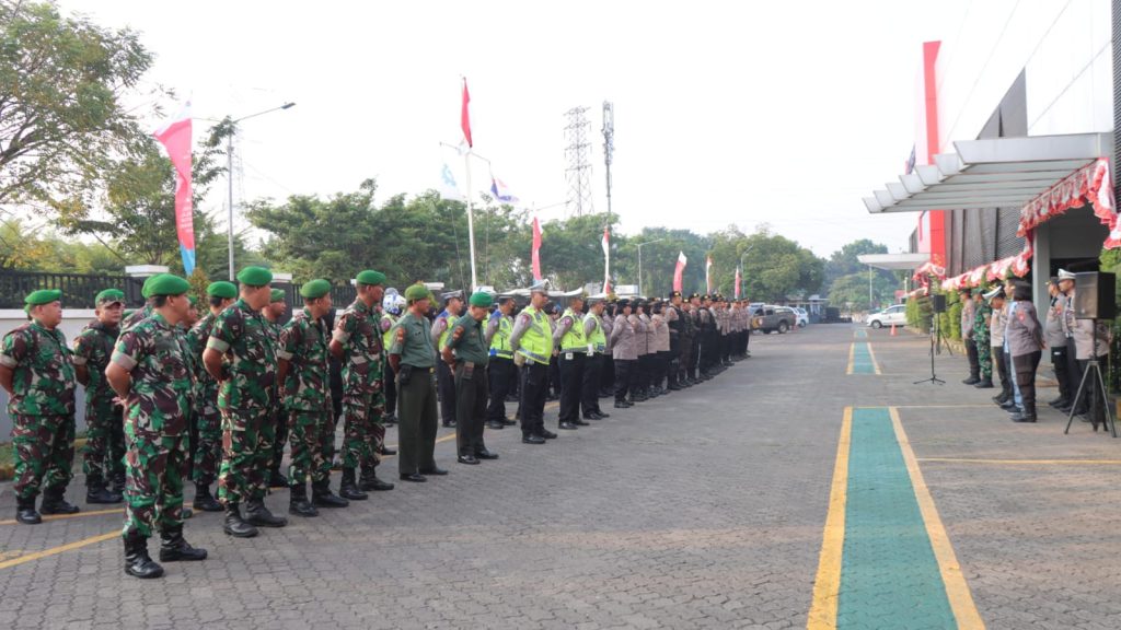 Ratusan personel gabungan TNI-Polri dan satpol PP melaksanakan apel kesiapan pengamanan aksi unjuk rasa terkait Aksi Sejuta Buruh.