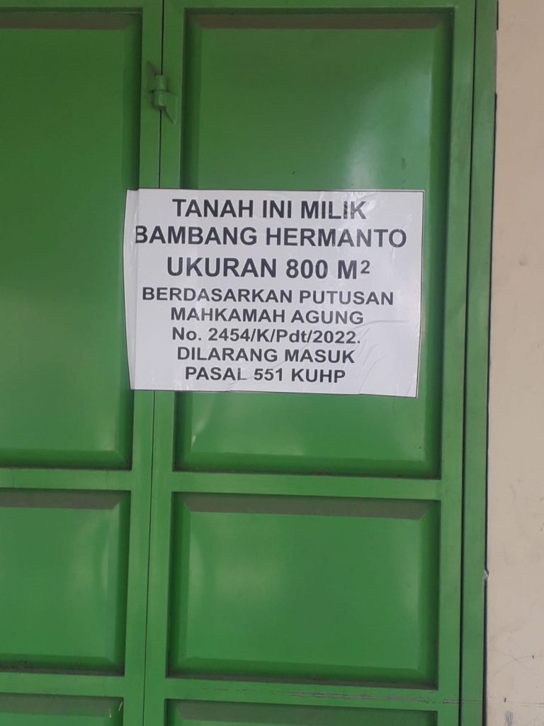 ” Kami hanya memberitahukan kepada khalayak umum khususnya warga sekitar bahwa dalam waktu dekat kami segera memasang plang dan melakukan pemagaran diatas lahan yang sudah diputuskan di Mahkamah Agung nomor: 2454/K/Pdt/2022 untuk saya amankan” ujar Bambang Hermanto.
