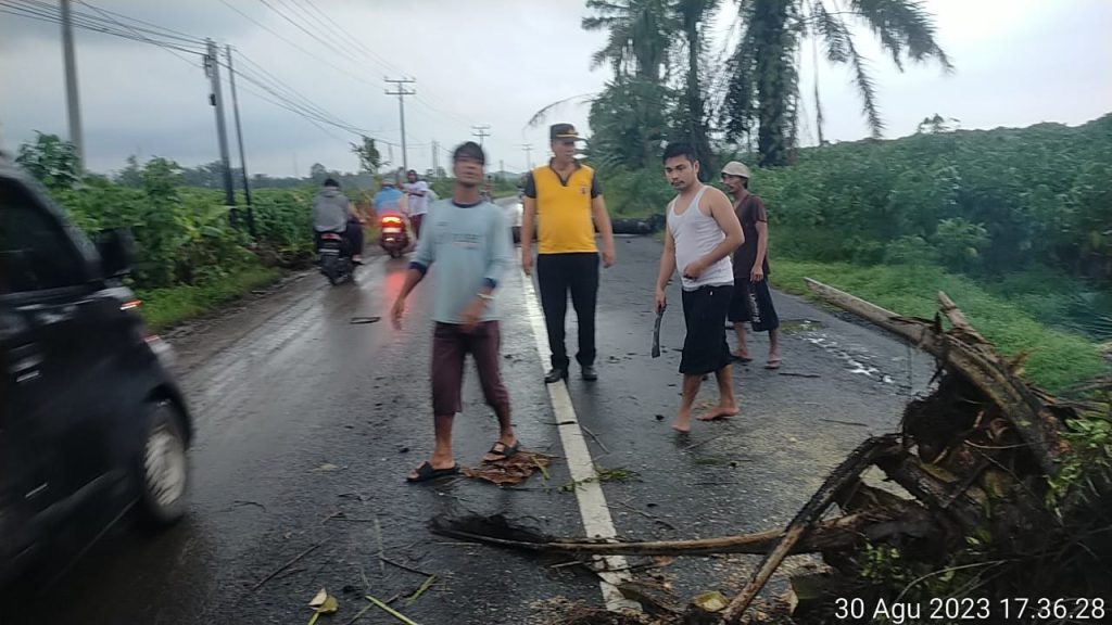 Dua pohon sawit tersebut tumbang akibat hujan deras dan angin kencang yang melanda wilayah tersebut.