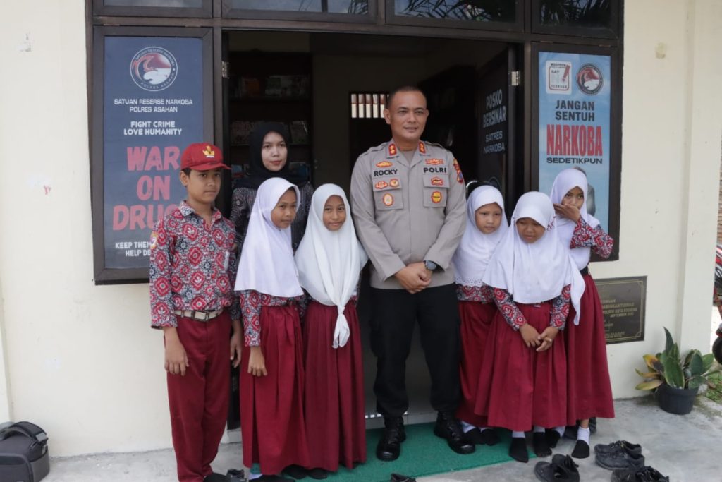 Kepolisian Resor (Polres) Asahan, melakukan edukasi kebiasaan membaca sejak dini pada anak-anak dengan mengunjungi Taman Baca Posko Bersinar Satnarkoba Polres Asahan, Kamis (31/08).