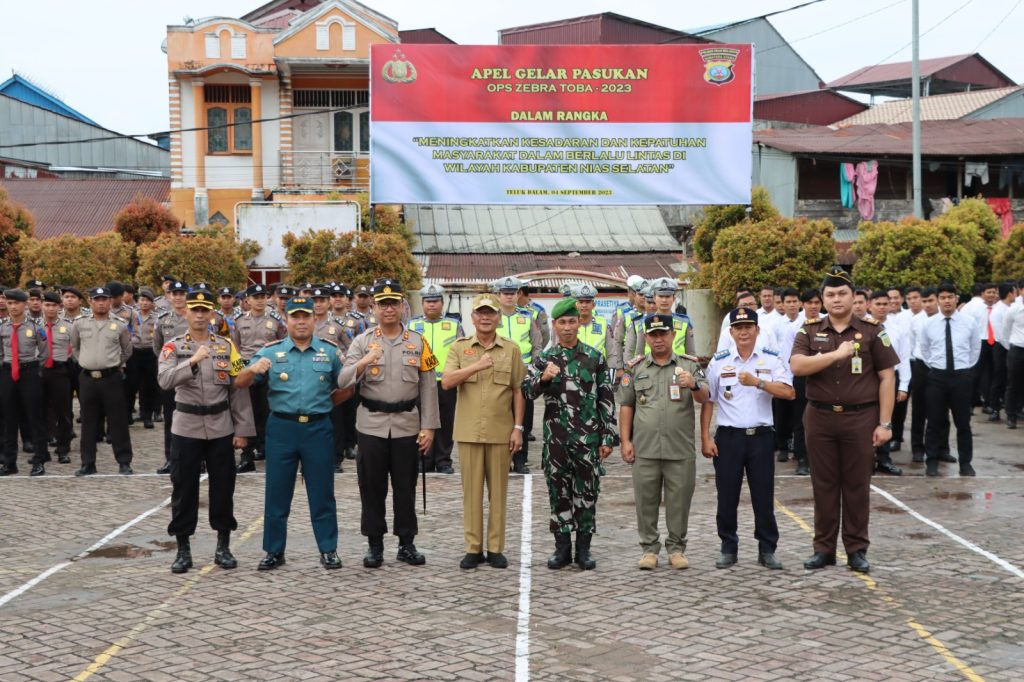 Dalam apel gelar pasukan ops zebra toba 2023 yang dilaksanakan dilapangan apel Mapolres Nias Selatan, dihadiri oleh Kapolres Nias Selatan, AKBP Boney Wahyu Wicaksono, SIK, Bupati Nias Selatan Hilarius Duha, S.H, M.H, , mewakili Kajari Nias Selatan, Novanema Duha, S.H, M.H (KasubbagBin), Mewakili Koramil 012/Teluk Dalam PELTU H. Hutabarat, Kasatpol PP Nias Selatan Dionisius Wau, Danlanal Nias Kolonel Laut (P) Wishnu Ardiansyah, Kepala Dinas Perhubungan Kabupaten Nias Selatan Drs. Faatulo Gulo, Personil Dishub Nias Selatan, Personil Satpol PP Kab. Nias Selatan, Personil Polres Nias Selatan, Personil TNI – AL Lanal Nias dan Personil Koramil 012 Teluk Dalam.