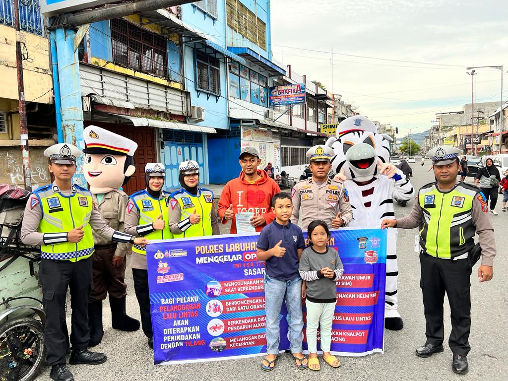 Tampak para Personel Sat Lantas Polres Labuhanbatu berkeliling di lokasi untuk membagikan Brosur dan Sticker, serta didampingi dengan Badut Polantas dan Badut Zebra yang bertujuan untuk semakin menarik perhatian dan minat masyarakat untuk mendengarkan apa yang disampaikan oleh Petugas Polri. (Edison Harianja).