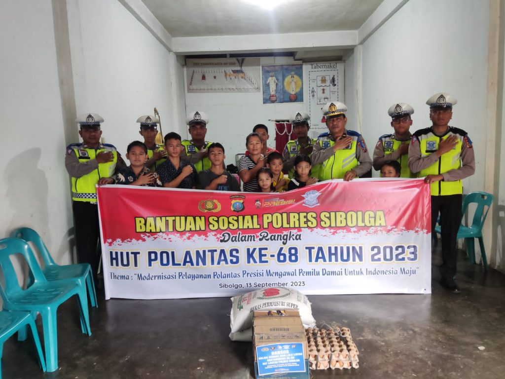 Kapolres Sibolga AKBP Taryono Raharja, SH, SIK, MH, melalui Plt. Kasat Lantas IPTU Pennedi Sihotang, saat dikonfirmasi mengatakan, “Dalam menyambut hari lalu lintas Bhayangkara Ke – 68, keluarga besar Sat Lantas Polres Sibolga memberikan bantuan sembako kepada 2 Panti Asuhan yang berada di Kota Sibolga, masing-masing Panti Asuhan mendapat 50 Kg beras, 2 papan telur dan 2 Kotak Indomie, sedangkan untuk pengemudi angkot dan abang beca disiapkan sebanyak 20 paket tiap paket 1 goni beras 5 Kg, 1 liter minyak makan dan 1 Kg gula pasir.