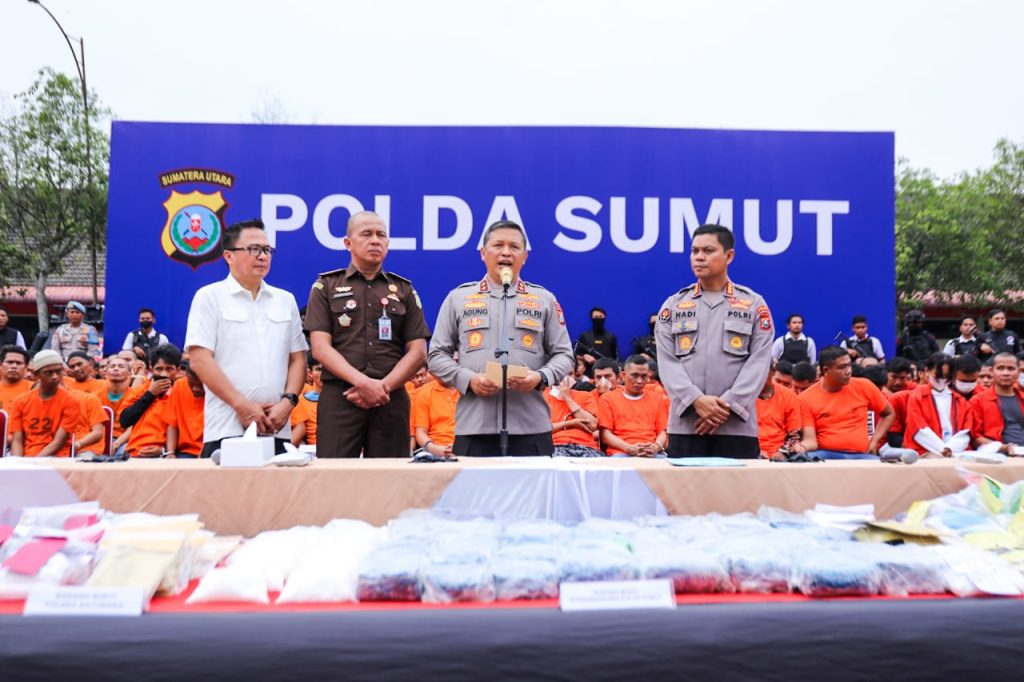 “Tadi malam kita tangkap 45 kilogram sabu. Sabu ini adalah jaringan juga dari Aceh untuk wilayah Sumatera. Untuk peredaran di Sumatera Utara sampai dengan Lampung, kita berhasil tangkap 11 orang jaringan ini dan kita akan kembangkan kembali,” kata Agung.