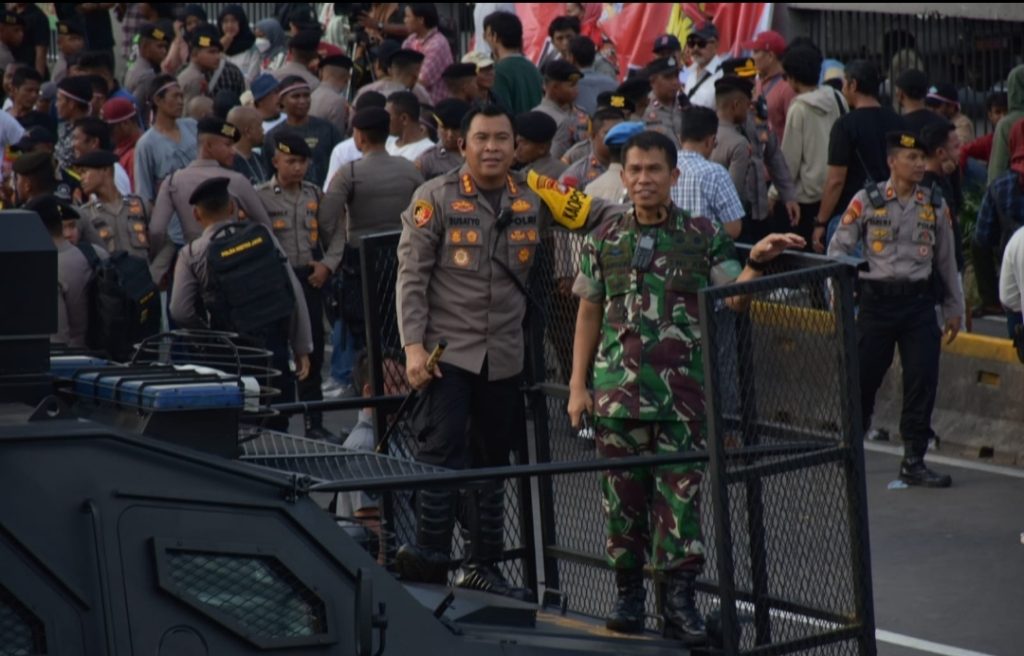 Foto : Komandan Kodim 0501/JP Letkol Inf I.E. Bangun Siregar, S.H. MIPOL bersama Kapolres Metro Jakarta Pusat Kombes Pol Susatyo Purnomo Condro, S.H., SIK, M.Si, mengecek langsung kesiapan personel yang melaksanakan pengamanan massa yang melaksanakan unjuk rasa (Unras) bertempat di depan pintu gerbang Gedung DPR/ MPR RI Senayan Jl. Jend Gatot Soebroto, Tanah Abang, Jakarta Pusat, Jumat, (1/3/2024)