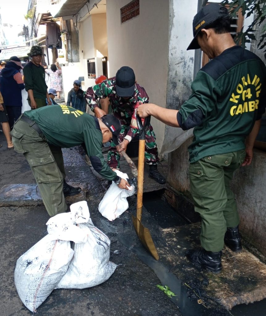 Upaya itu diwujudkan dengan melakukan kerja bakti bersama, yang kali ini dilakukan dengan mengangkat sampah maupun lumpur yang berada di saluran air, sehingga tidak terjadi penyumbatan disaat curah hujan yang semakin tinggi seperti saat ini”, ungkap Danramil 04/Gambir di Makoramil.