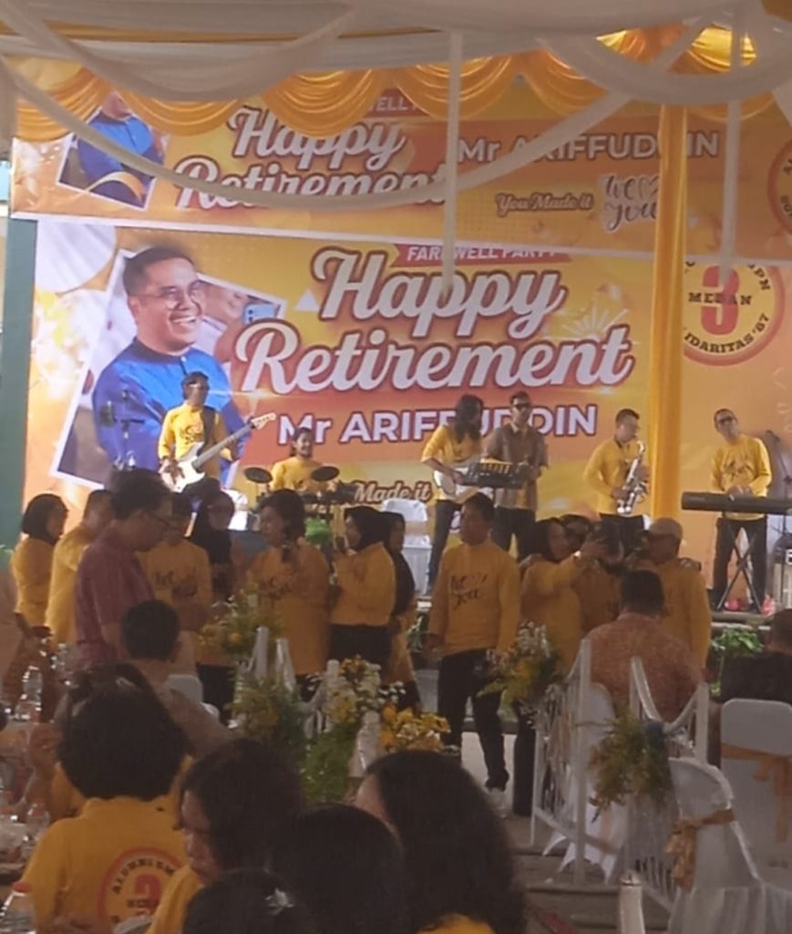 Sebagai penghormatan atas pengabdiannya terhadap Alumni SMPN 3 Medan khususnya Angkatan 87′ berkolaborasi guru – guru dan pegawai SMPN 3 Medan buatkan panggung yang bertajuk “Happy Retirement” Mr.Ariffuddin di SMPN 3 Medan jalan Pelajar No. 69 Kelurahan Teladan Timur Kecamatan Medan Kota. Kota Medan, Sabtu (31/8/2024).