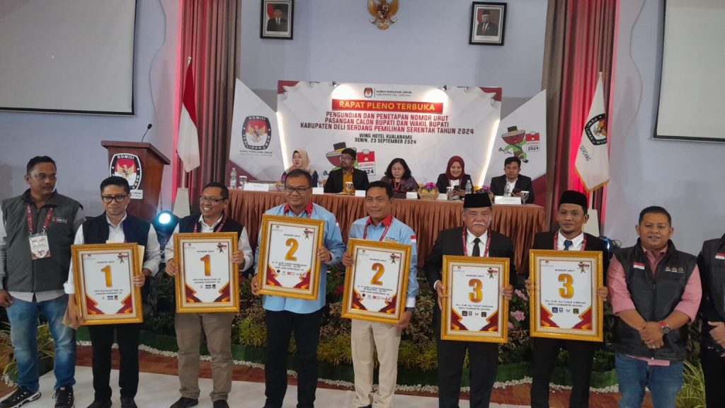 Deli Serdang,(Infokasus 24.com)- Rapat Pleno Terbuka pengundian nomor urut pasangan calon Bupati dan Wakil Bupati Kabupaten Deli Serdang untuk Pemilihan serentak 2024 sukses digelar pada Senin, (23/9/2024), bertempat di Aula Hotel Wing, Jalan Sultan Serdang Desa Tumpatan Nibung, Kecamatan Batang Kuis. Acara dimulai pukul 20.00 WIB dan berlangsung hingga selesai dengan suasana yang tertib, aman, dan kondusif.