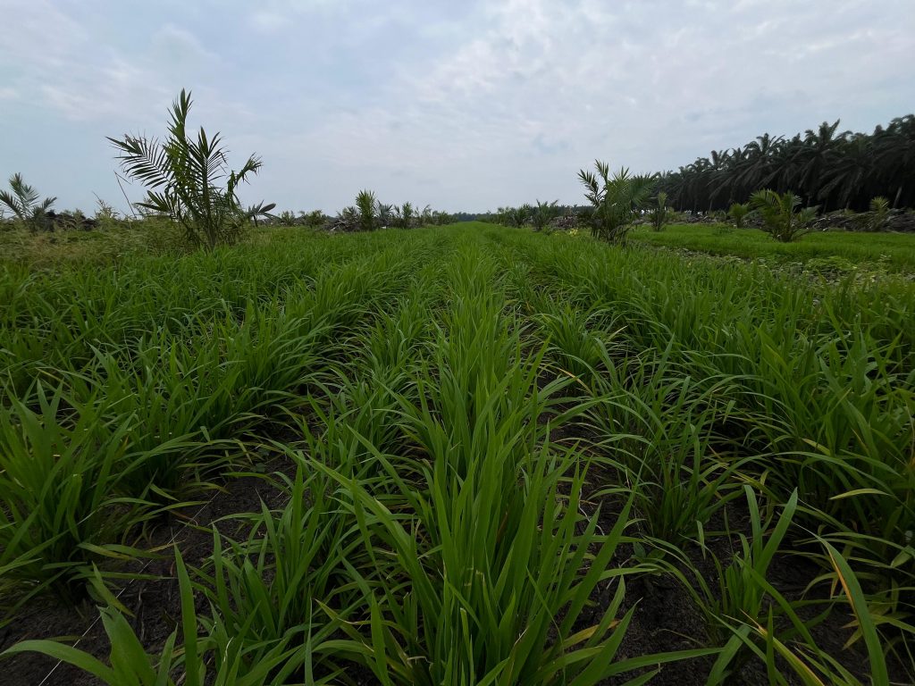 Bersama Riset Perkebunan Nusantara, Institut Pertanian Bogor, serta didukung penuh Kementerian Koordinator Bidang Pangan, Kementerian Pertanian, dan Kementerian BUMN, hamparan padi di tengah tanaman sawit muda itu tumbuh subur dan diproyeksi akan segera panen.