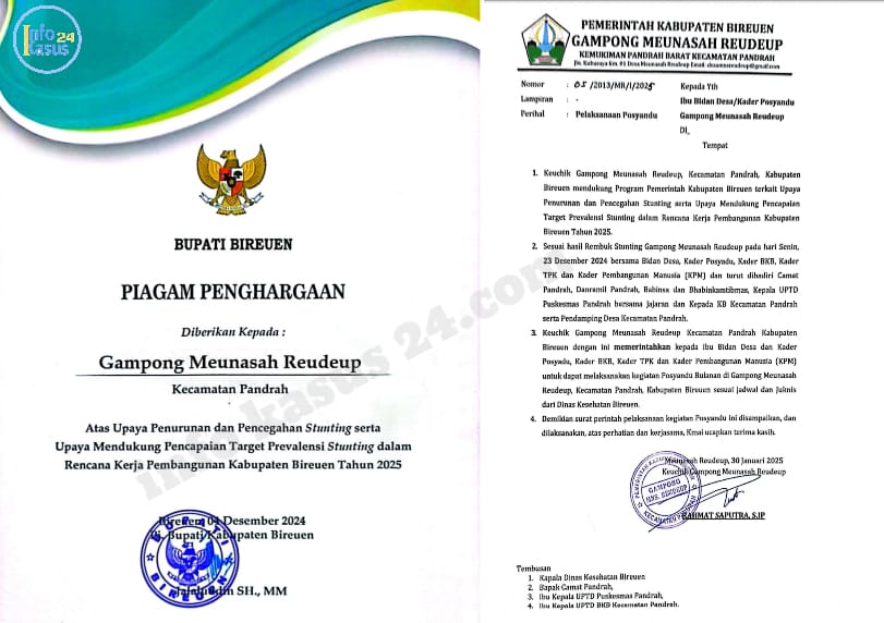 “Saya sudah mengeluarkan surat tugas nomor 05/2023/MR/1/2025, (30/1/2025) yang ditujukan kepada bidan desa dan kader Posyandu agar tetap menjalankan tugasnya seperti biasa,” jelas Keuchik Rahmat Saputra.