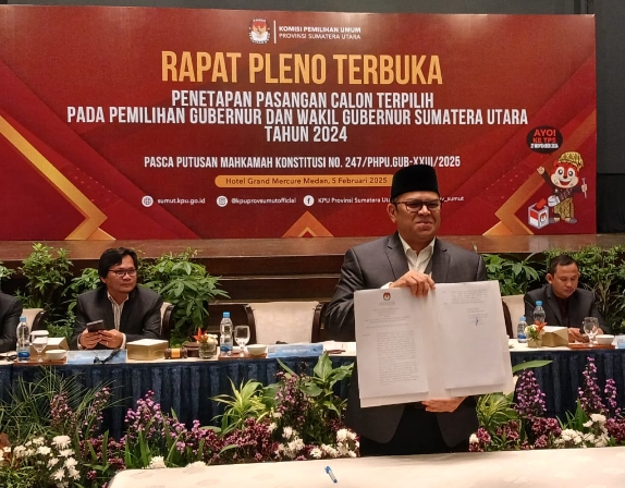 Medan,(Infokasus24.com)- Komisi Pemilihan Umum (KPU) Provinsi Sumatera Utara (Sumut) resmi menetapkan pasangan Bobby Nasution dan Surya sebagai Gubernur dan Wakil Gubernur. Penetapan ini berlangsung pada rapat pleno terbuka KPU Sumut yang berlangsung di Hotel Grand Mercure, jalan Perintis Kemerdekaan, Medan Timur, Kota Medan, Rabu (5/2/2025).