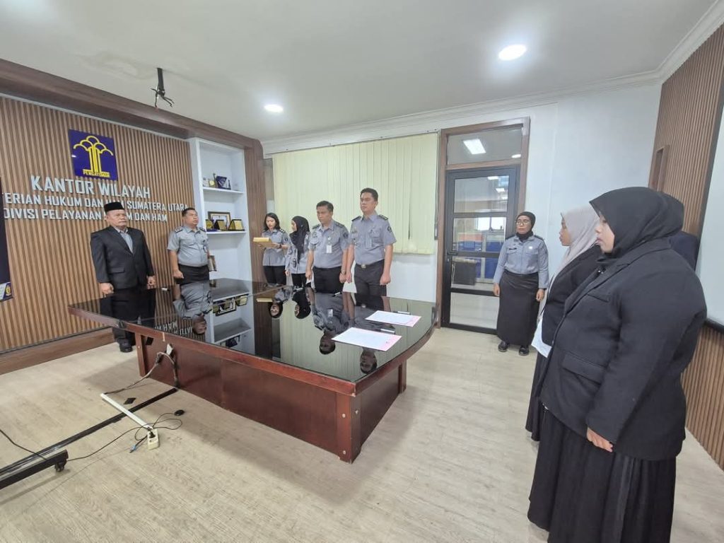 Medan, (infokasus24.com) – Kepala Divisi Pelayanan Hukum Kantor Wilayah Kementerian Hukum Sumatera Utara, Sahata Marlen Situngkir melantik Dua (2) orang Notaris Pengganti, yaitu Naimatun Aliyah, S.H. dan Ria Dasniar, S.H. di Ruang Rapat Divisi Pelayanan Hukum Kantor Wilayah Kementerian Hukum Sumatera Utara. Notaris Pengganti tersebut merupakan Notaris Pengganti di Kota Medan, Senin (14/04/25)