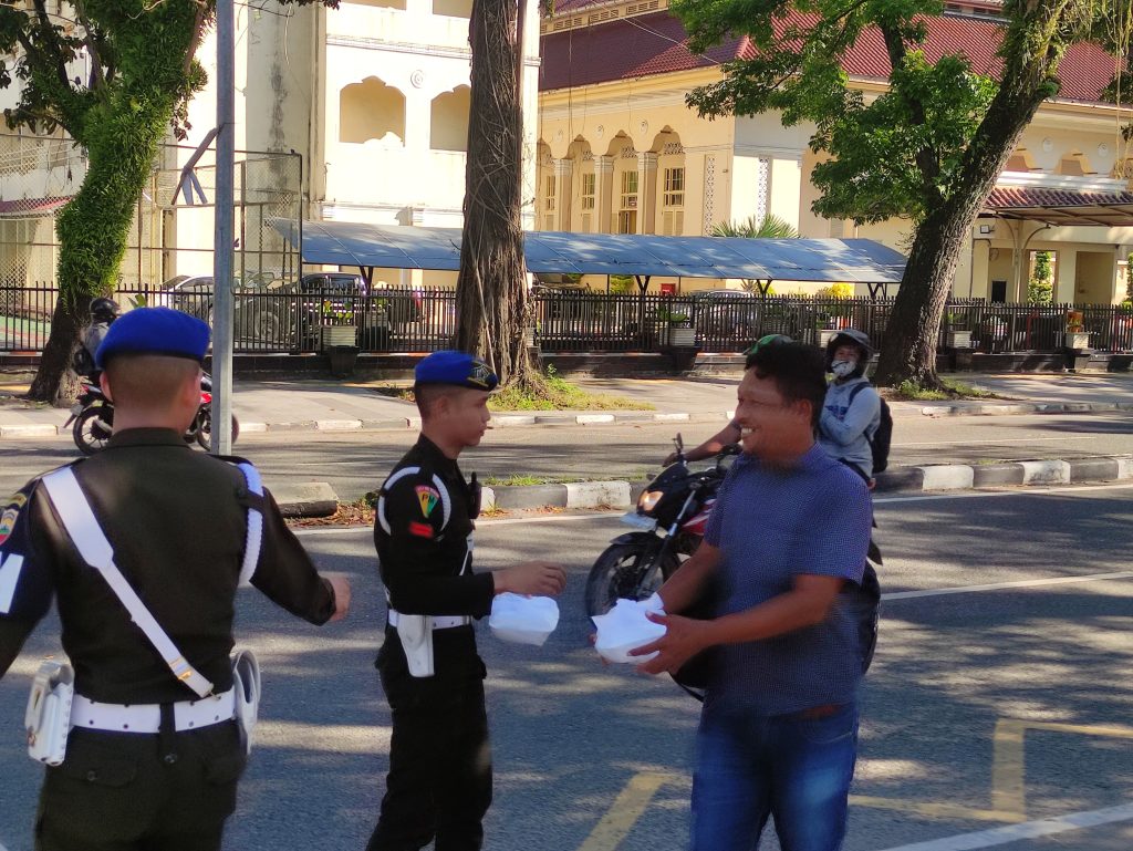 Seusai menggelar briefing dilapangan apel Markas Denpom 1/5 Medan, belasan personel yang sedang tugas dalam kantor langsung membagikan puluhan paket makanan untuk sarapan kepada warga yang melintas di seputaran Jalan Letjen Suprapto Medan.
