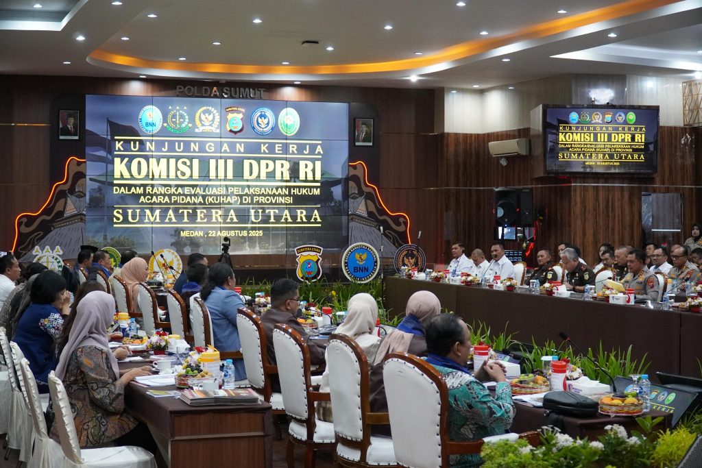Medan, (Infokasus24.com) – Rapat Dengar Pendapat (RDP) Komisi III DPR RI dalam rangka evaluasi pelaksanaan Kitab Undang-Undang Hukum Acara Pidana (KUHAP) berlangsung di Aula Polda Sumatera Utara dengan dihadiri seluruh Forkopimda Sumut, Jumat (22/08/25).