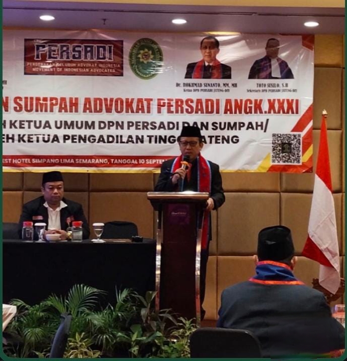 Semarang, (Infokasus24.com) – Ketua DPD Persadi Jateng-DIY, Irjen Pol (Purn) Dr. Rokhmad Sunanto, MM, MH, CRM yang mewakili Ketua Umum Dewan Pimpinan Nasional (DPN) Persadi, Syam Daeng Rani, SH, memimpin Pelantikan dan Sumpah Advokat Persadi Angkatan XXXI, bertempat di Quest Hotel Semarang, Rabu (10/9/2025).