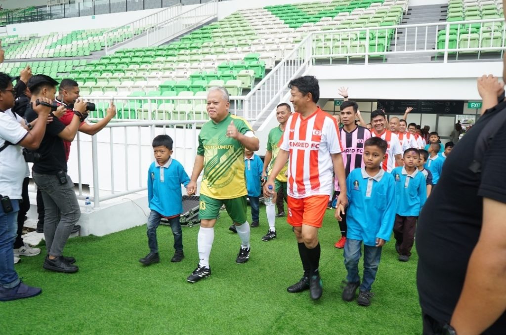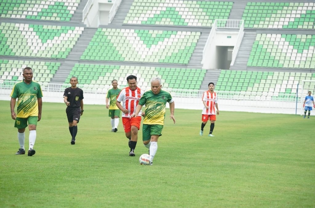 Photo : Kepala Kejaksaan Tinggi Sumatera Utara Dr.Harli Siregar, SH.,M.Hum (pakai baju olahraga hijau) menggelar olahraga pertandingan bersama para pimpinan redaksi (Pemred) Media nasional maupun media lokal di Sumatera utara dan kota Medan yang berlangsung di stadion utama sumatera utara yang berlokasi di komplek Sport Centre Sumatera Utara,