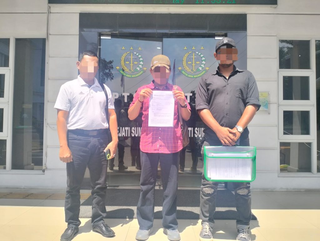 Foto : Sugianto dan rekannya membuat laporan ke Kejaksaan Tinggi Sumatera Utara atas penyerobotan tanahnya di Desa Sidomakmur, Jumat (26/9/2025).