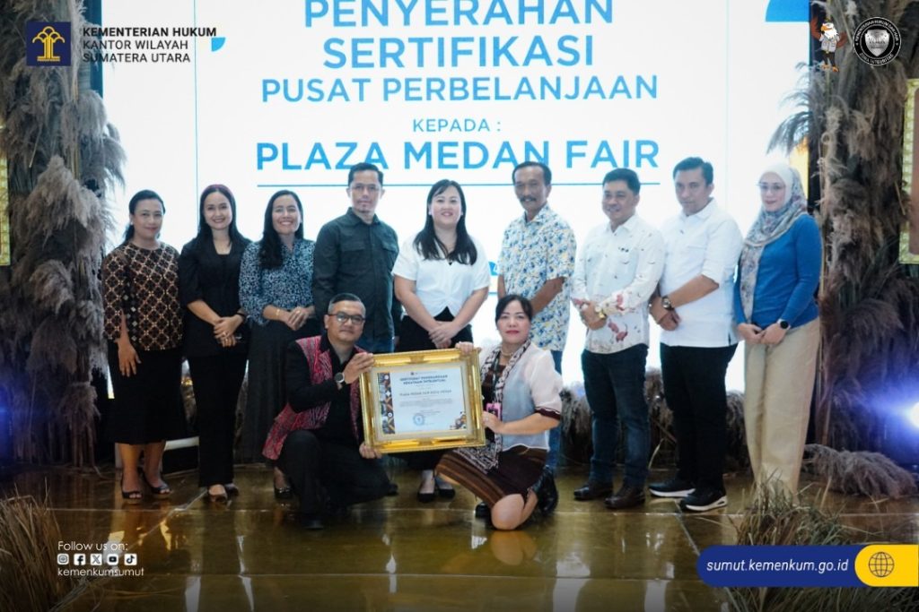 Pada kesempatan tersebut, Kakanwil Kemenkum Sumut Ignatius Mangantar Tua Silalahi menyerahkan Sertifikat Penghargaan Kekayaan Intelektual (KI) kepada Plaza Medan Fair sebagai Pusat Perbelanjaan Berbasis Kekayaan Intelektual, Sabtu (27/9/2025).