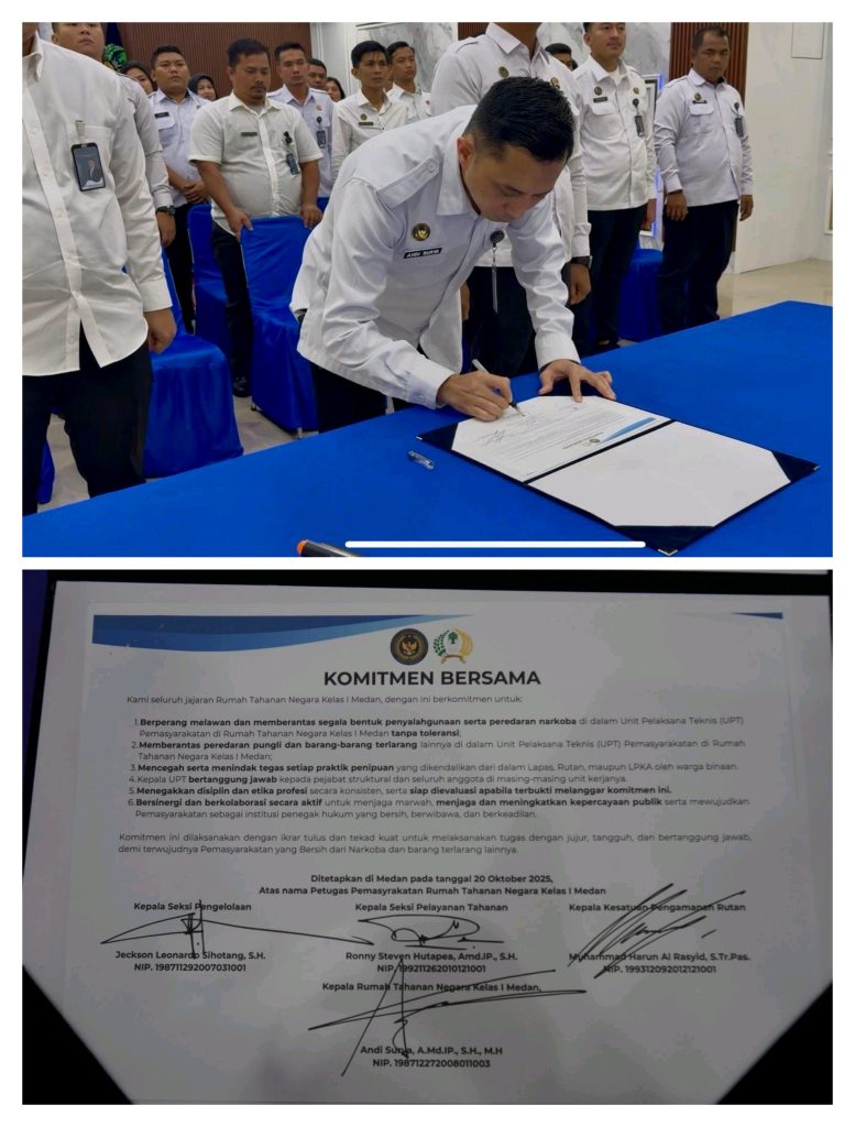 “Melalui penandatanganan komitmen ini, kami menegaskan kembali tekad bersama untuk menjadikan Rutan Kelas I Medan sebagai lingkungan kerja yang bersih dari narkoba, bebas dari handphone, serta barang terlarang lainnya. Integritas dan profesionalitas adalah harga mati bagi setiap petugas Pemasyarakatan”, ujar Andi.